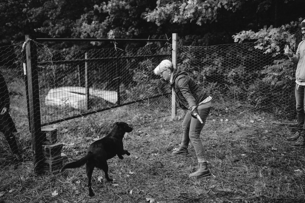 Matt showing us how to pluck the feathers off the bird after scalding it for about 20 seconds in hot water.Miggie, the farm’s security dog, looks on as he sports his “off duty” sweater.