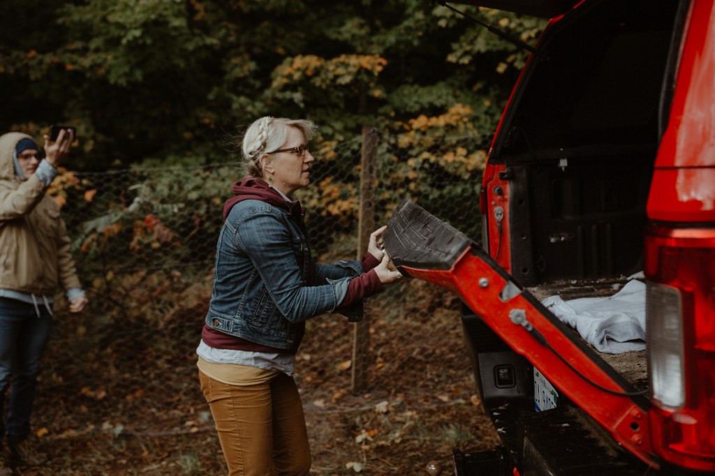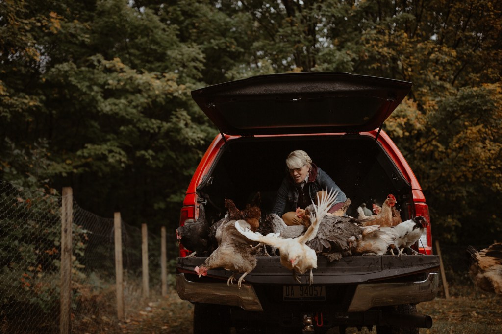 Luckily, the rain let up and around 3:30p that day we began to load the hens into the back end of my husband’s F-350 Ford truck. One-by-one and sometimes four hens at a time – I am a master at holding multiple chickens at once – we loaded them into the truck. A few screeching squawks, a few flying feathers, and a few pitiful pecks later, we had all sixty-some hens loaded into the truck.